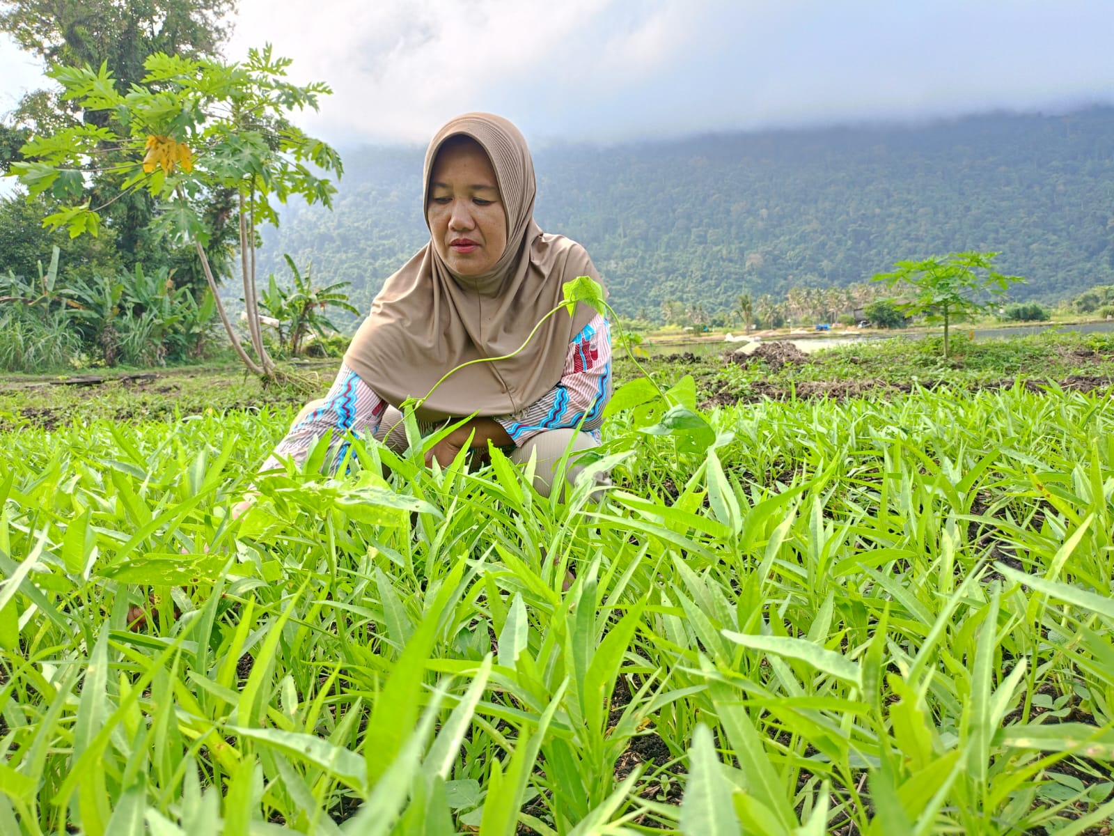 Ibu Sudariam dan tiga ibu lainnya senyum semringah menatap kebun yang sebentar lagi bakal dipasok ke pasar lokal.