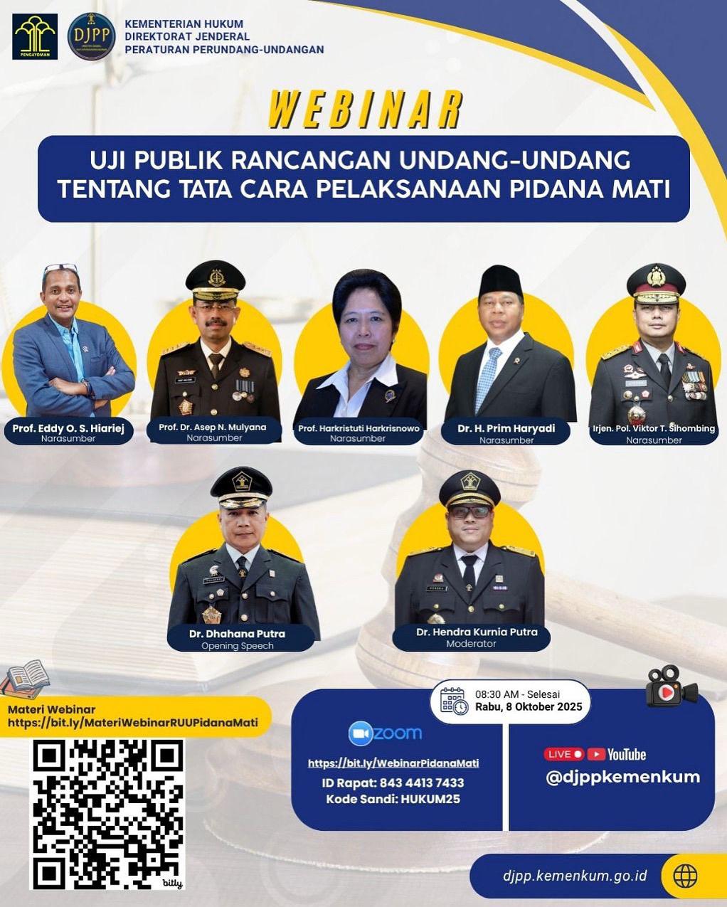 PALU. PIJARSULTENG.ID,– Kantor Wilayah Kementerian Hukum Sulawesi Tengah (Kanwil Kemenkum Sulteng) mengajak seluruh masyarakat untuk turut hadir dan berpartisipasi dalam Webinar Uji Publik Rancangan Undang-Undang tentang Tata Cara Pelaksanaan Pidana Mati, yang akan diselenggarakan pada Rabu, 8 Oktober 2025 pukul 08.30 WIB melalui Zoom Meeting dan siaran langsung YouTube @djppkemenkum.