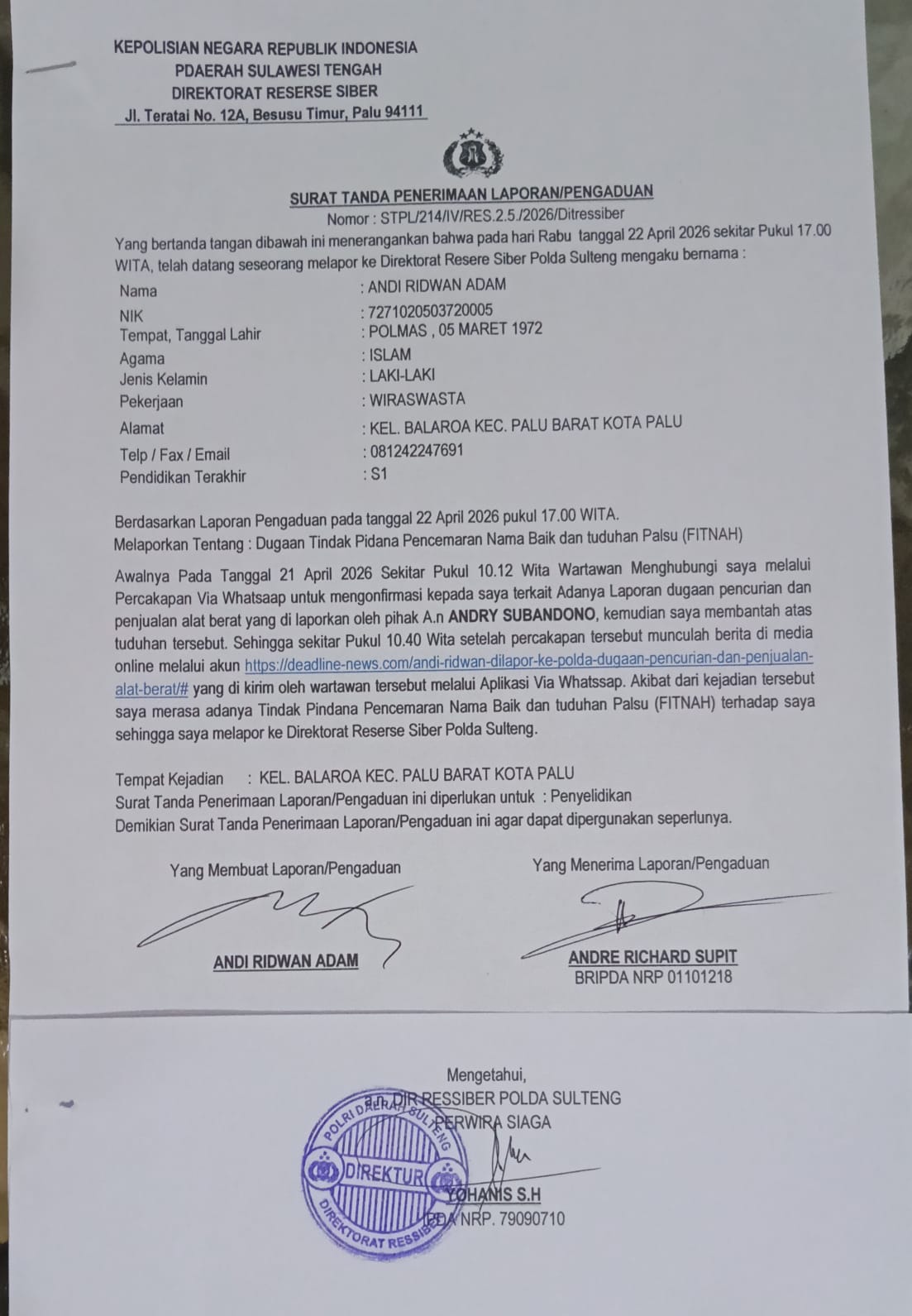 “Berdasarkan 4 Point inilah, saya datang di Kantor DITRESSIBER POLDA SulTeng hari ini Rabu 22 April 2026, untuk buat Laporan Polisi (LP) atas tuduhan Palsu (Fitnah) terhadap diri saya, ” jelas Andi Ridwan Adam usai melapor di kantor Polisi yang dilakukan oleh saudara Andry Subandono ,dan publikasi lewat media D.News milik saudara Andi Attas, merupakan bagian dari pelanggaran Kode etik Jurnalistik yang sengaja di sebarluaskan, sehingga dapat dikatakan tindak pidana Pasal fitnah dan pencemaran nama baik dalam KUHP Baru (UU No. 1 Tahun 2023, yang berlaku mulai 2026 diatur dalam Pasal 433 (Pencemaran) dan Pasal 434 (Fitnah).