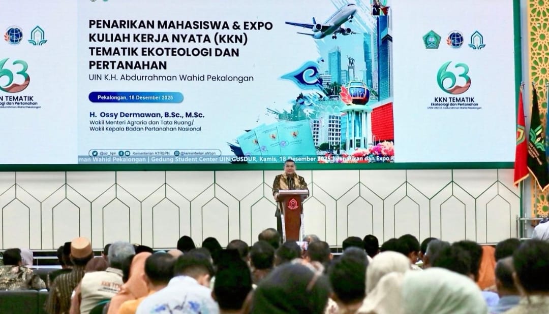 PEKALONGAN. PIJARSULTENG.ID– Wakil Menteri Agraria dan Tata Ruang (Wamen ATR)/Wakil Kepala Badan Pertanahan Nasional (Waka BPN), Ossy Dermawan, resmi menutup kegiatan Kuliah Kerja Nyata (KKN) Tematik Ekoteologi dan Pertanahan, Universitas Islam Negeri (UIN) K.H. Abdurrahman Wahid Pekalongan yang diikuti 500 mahasiswa, Kamis (18/12/2025). Dalam sambutannya, ia mengapresiasi dedikasi mahasiswa dalam mendukung pencatatan bidang tanah wakaf.